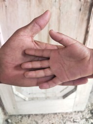 A child is holding a boy's hand